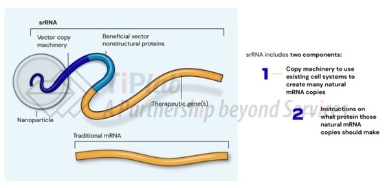 Replicate拥有专有 srRNA 技术工具箱,可定制其蛋白质表达谱。其中,srRNA保留病毒基因组中的复制模块,但去除了编码病毒结构蛋白的序列。使用LNP递送至体内后,srRNA 可以在细胞内自我复制并持续生成目标 mRNA,srRNA 就像一本“说明书”,指导细胞如何合成目标蛋白所需的天然 mRNA。srRNA 可以表达多种类型的治疗分子,包括抗原、抗体、细胞因子、酶和蛋白质激动剂或拮抗剂。