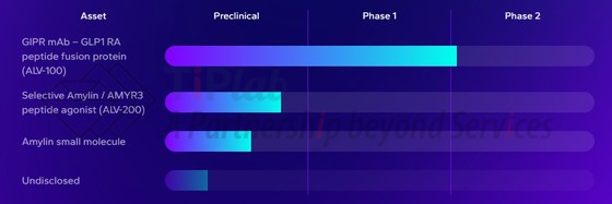 ALV-100 是一种双功能 GIPR 拮抗剂/GLP-1R 激动剂融合蛋白,由GIPR IgG4 人源化抗体和GLP-1类似物多肽融合而成,旨在提供强效、持久的减肥和维持效果,且具有给药优势(目标是每季度给药一次)。