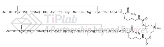Pegcetacoplan 是一种对称分子,由两个相同的十五肽通过共价键连接至一个线性的 40 kDa PEG分子的两端构成。Pegcetacoplan 的肽段部分在第 4 位含有 1-甲基-L-色氨酸(Trp(Me)),在第 14 位含有氨基(乙氧基乙氧基)乙酸(AEEA)。